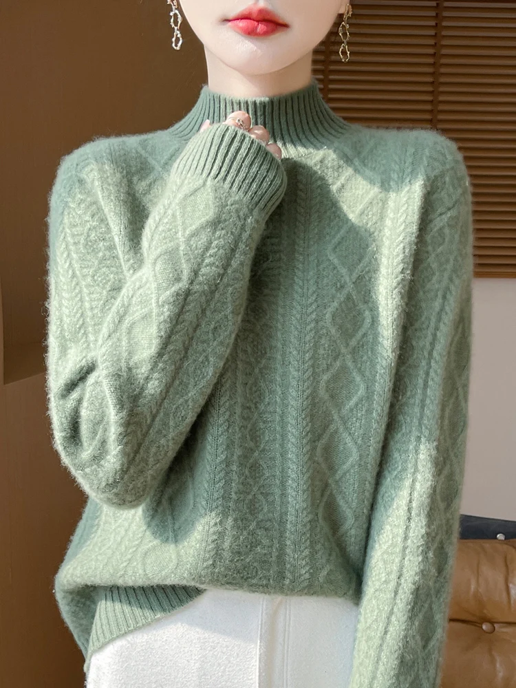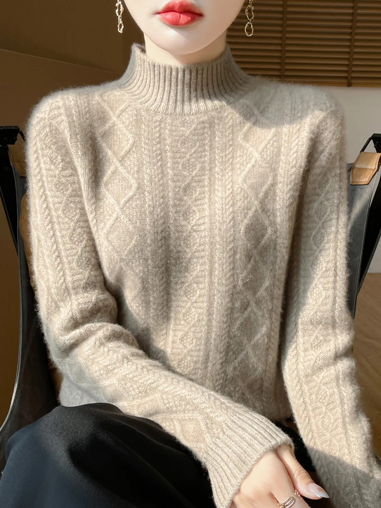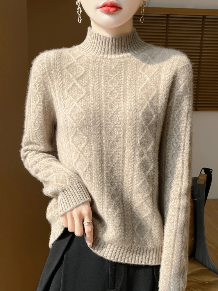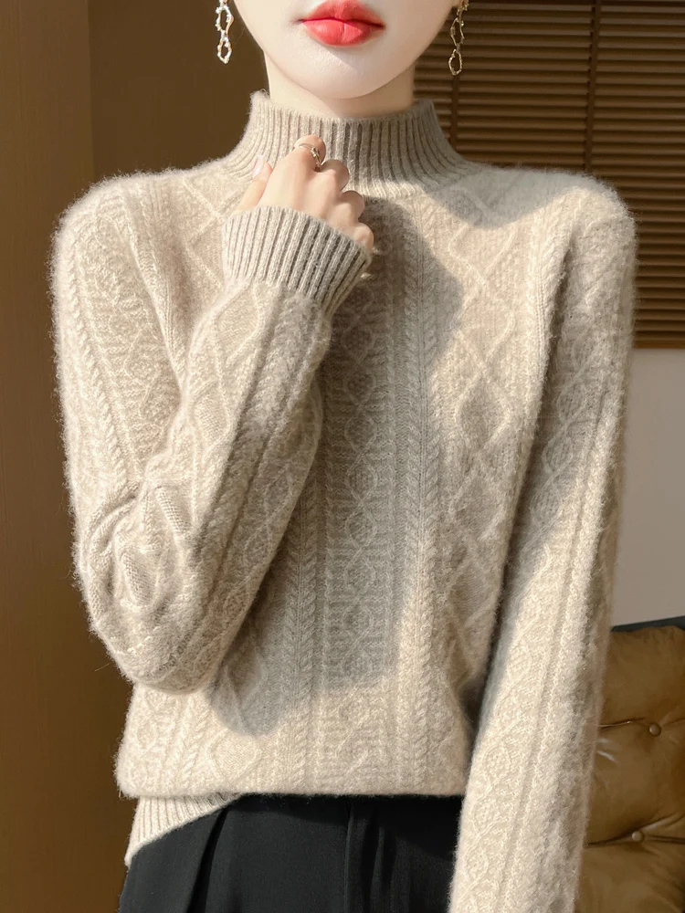 Naiste 100% meriinovillast madala kaeluse ja palmikmustriga kampsun M-XXL