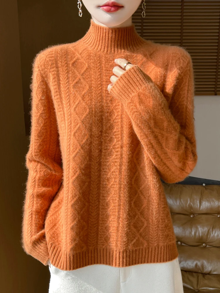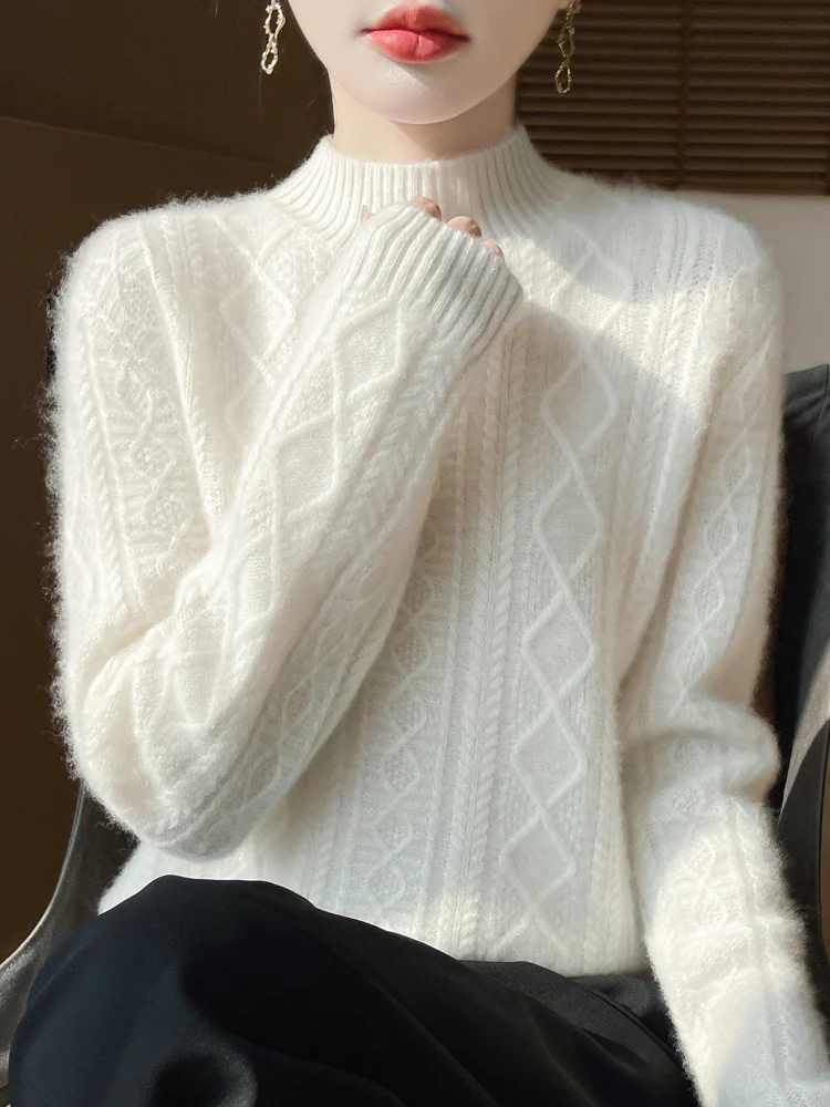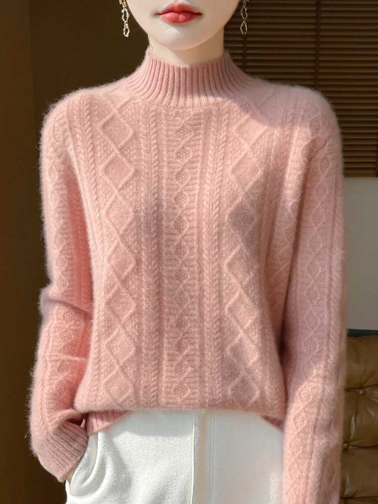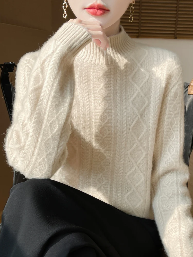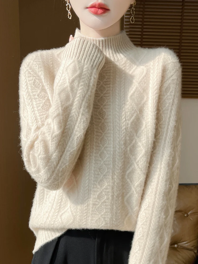 Naiste 100% meriinovillast madala kaeluse ja palmikmustriga kampsun M-XXL