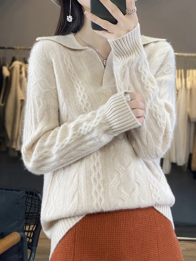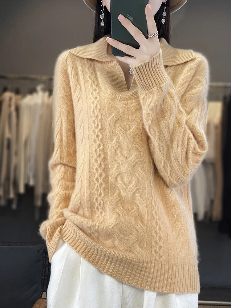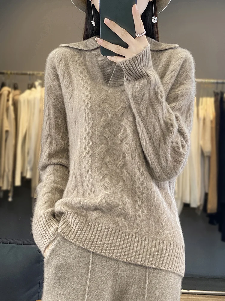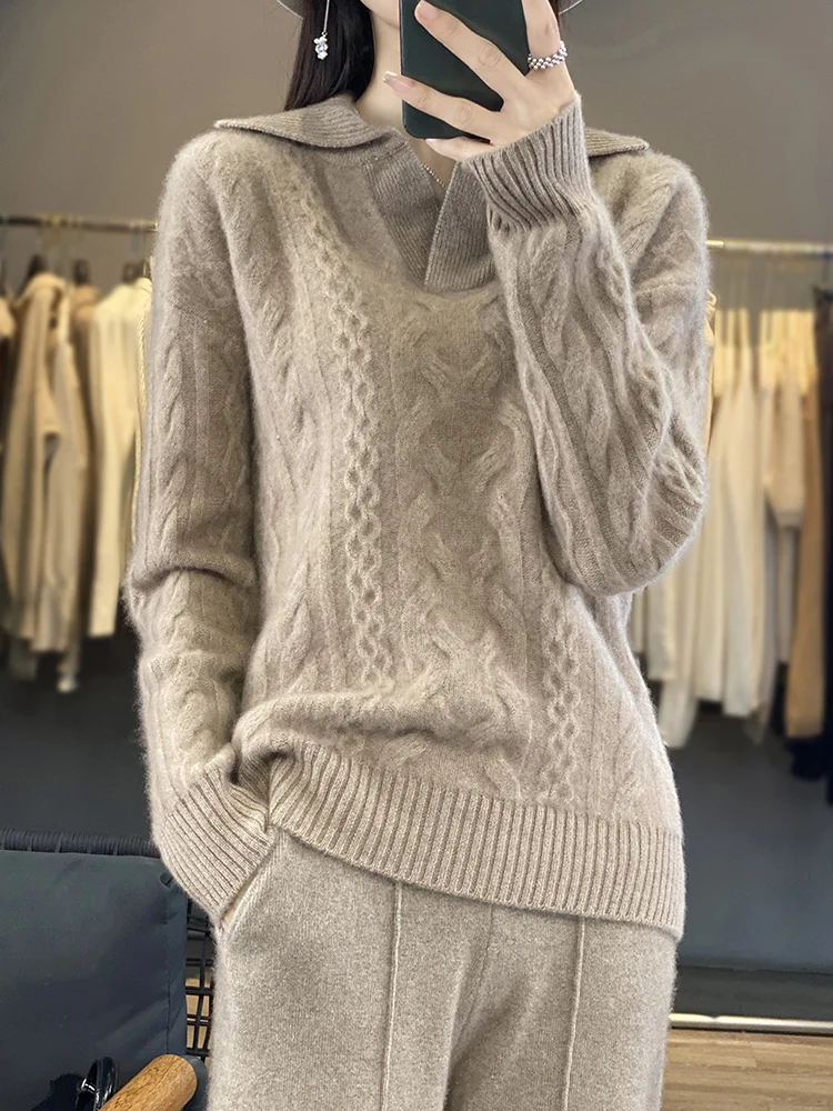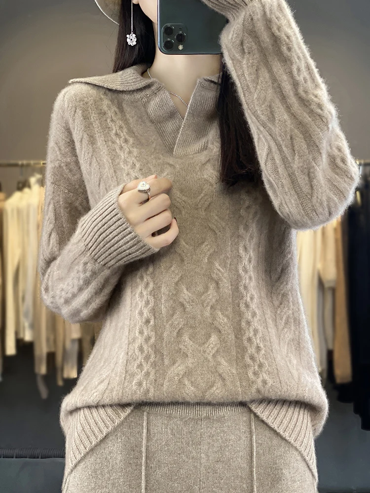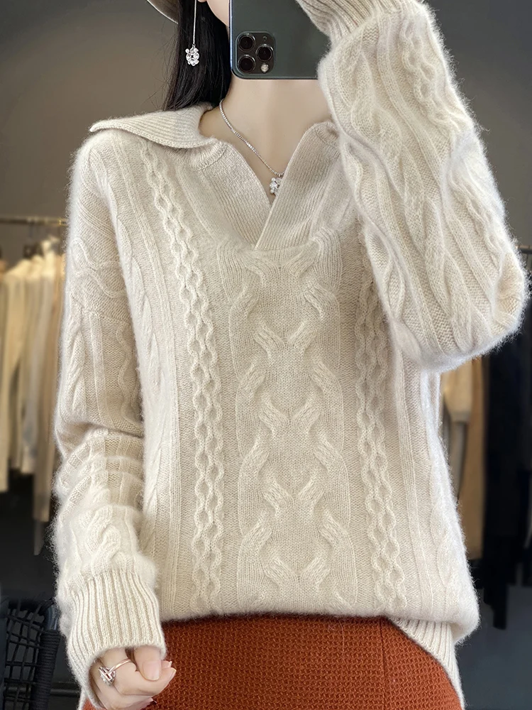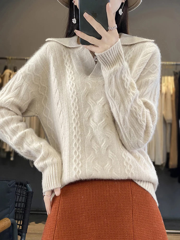 Naiste 100% meriinovillast v-kaeluse, laia krae ja palmikmustritega kampsun S-XXL